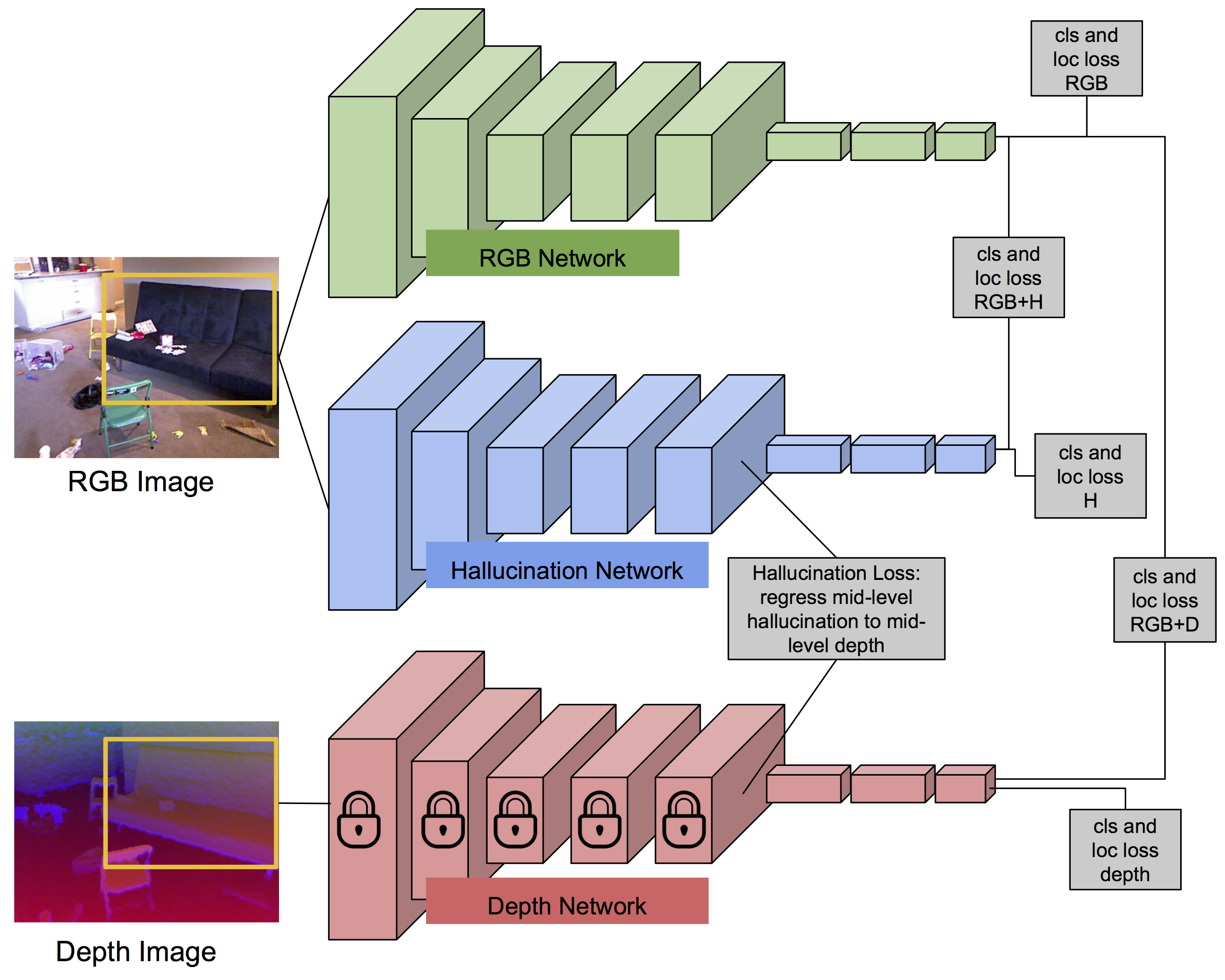 We propose a technique to adapt CNN based object detectors trained on RGB images to effectively leverage depth images at test time to boost detection performance.